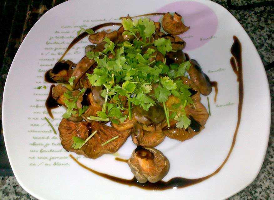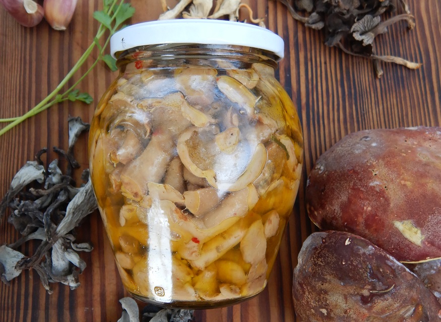 Se utilizar Laetiporus sulphureus (galinha-do-mato) comece por cortar o cogumelo em filetes. No caso do cogumelo-ostra (Pleurotus ostreatus) escolha os cogumelos mais finos. Tempere os cogumelos com sal, sumo de limão, alho cortado finamente, pimenta preta moída na hora, uma folha de louro e um borrifo de azeite. Deixe marinar durante 10 minutos.