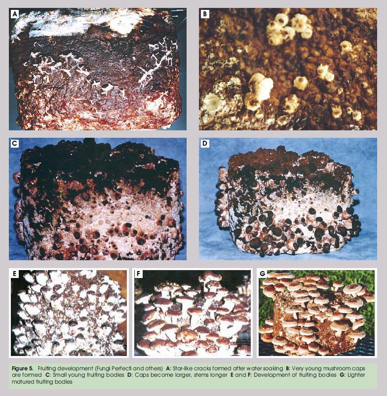 Para induzir a frutificação, submergem-se os blocos em água fria (em alternativa abre-se o saco de polietileno e enche-se de água até o substrato estar coberto), durante 12 a 24 horas.